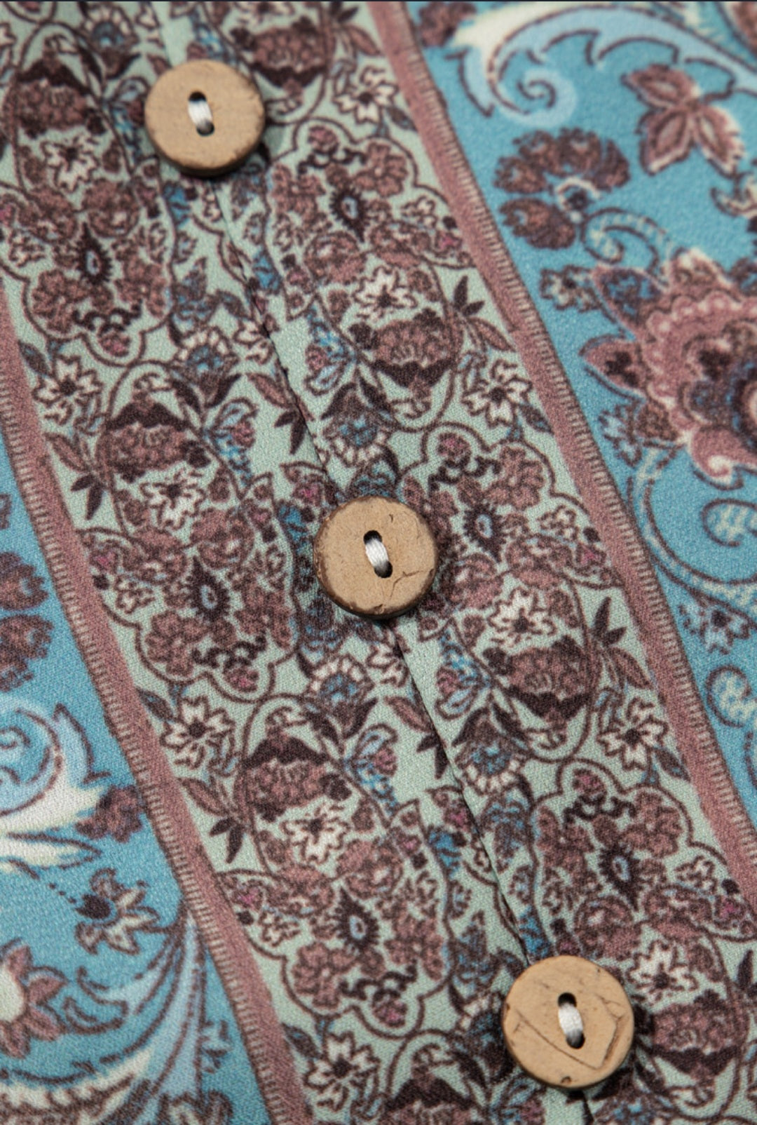 White Boho Pattern Ruffle Sleeve BlouseΒ
